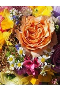 Mixed flowers in a handled basket