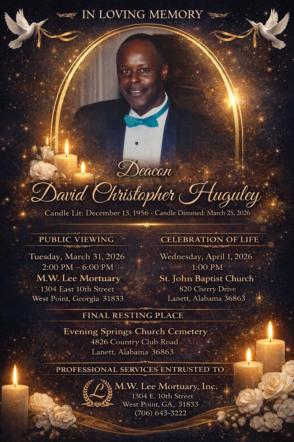 Funeral Services for Deacon David C. Huguley, will be held on Wednesday, April 1, 2026 at 1:00 p.m. EST in the sanctuary of St. John Baptist Church, 820 Cherry Drive, Lanett, Alabama 36863. Reverend Charles Trammell, Pastor, Reverend Elijah Jackson, Eulogist, Reverend Edward Lane, Officiating and Dr. D. Jordan, Assisting. Interment will follow in the Evening Springs Church Cemetery, 4826 Country Club Road, Lanett, Alabama 36863.