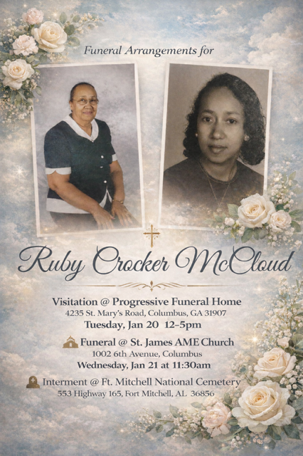 The Homegoing Celebration for Mrs. McCloud will be held on Wednesday, January 21, 2026, at 11:30 a.m. at St. James AME Church with interment at Ft. Mitchell National Cemetery. Visitation will be on Tuesday, 12:00 p.m. to 5:00 p.m. at Progressive.