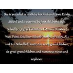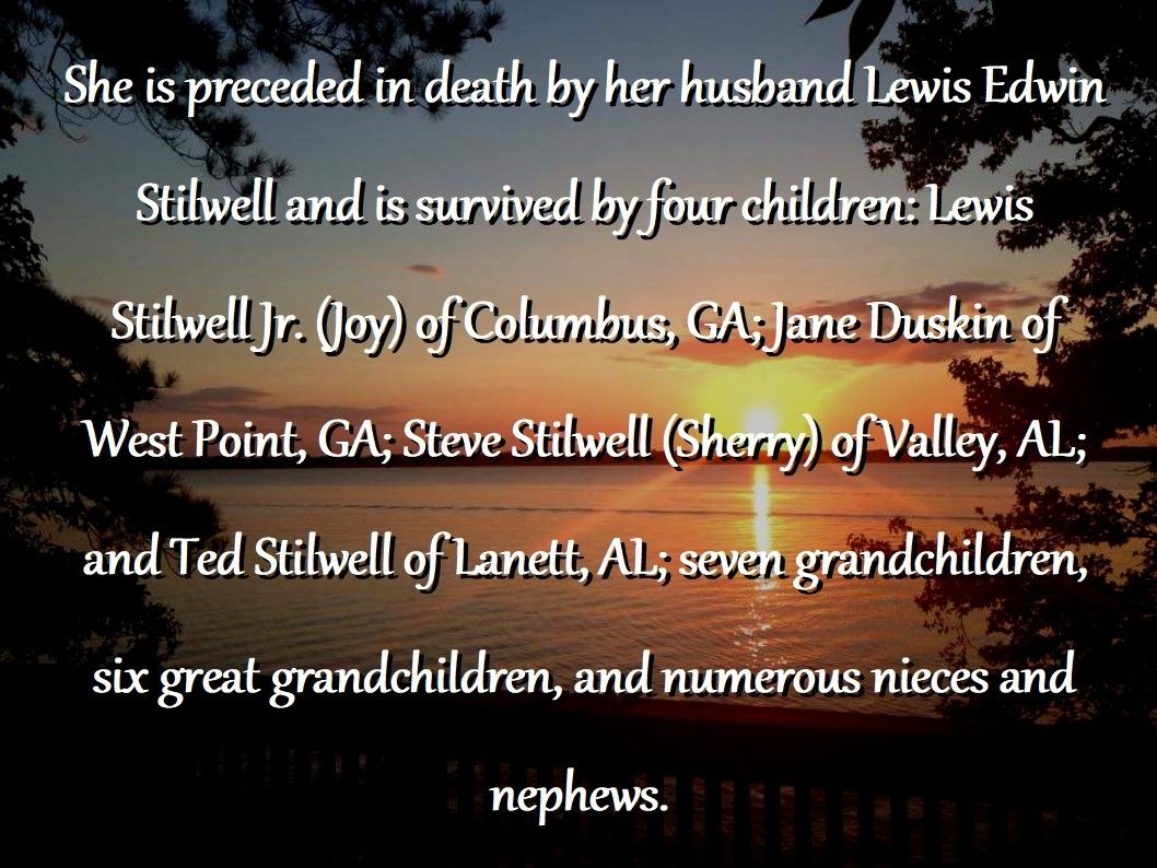 She is preceded in death by her husband Lewis Edwin Stilwell and is survived by four children: Lewis Stilwell Jr. (Joy) of Columbus, GA; Jane Duskin of West Point, GA; Steve Stilwell (Sherry) of Valley, AL; and Ted Stilwell of Lanett, AL; seven grandchildren, six great grandchildren, and numerous nieces and nephews.