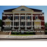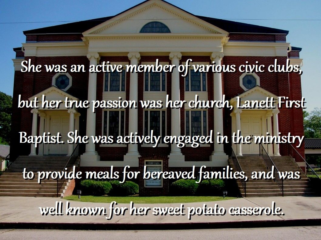 She was an active member of various civic clubs, but her true passion was her church, Lanett First Baptist. She was actively engaged in the ministry to provide meals for bereaved families, and was well known for her sweet potato casserole.