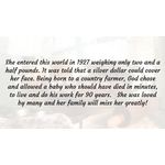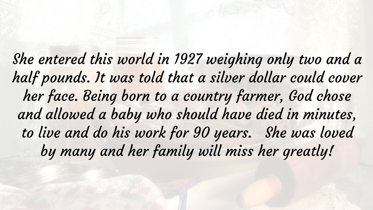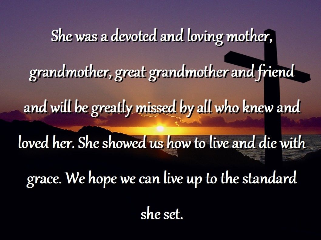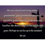 She was a devoted and loving mother, grandmother, great grandmother and friend and will be greatly missed by all who knew and loved her. She showed us how to live and die with grace. We hope we can live up to the standard she set.
