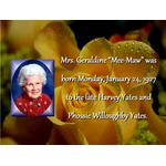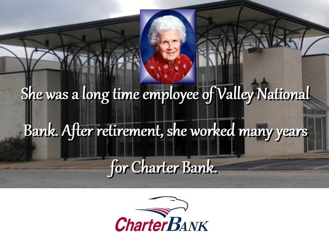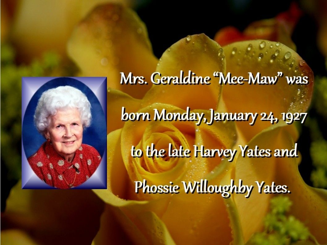 Mrs. Geraldine “Mee-Maw” was born Monday, January 24, 1927 to the late Harvey Yates and Phossie Willoughby Yates. She was a long time employee of Valley National Bank. After retirement, she worked many years for Charter Bank.