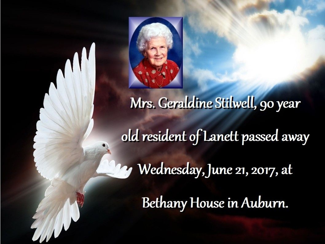 Mrs. Geraldine Stilwell, 90 year old resident of Lanett passed away Wednesday, June 21, 2017, at Bethany House in Auburn.