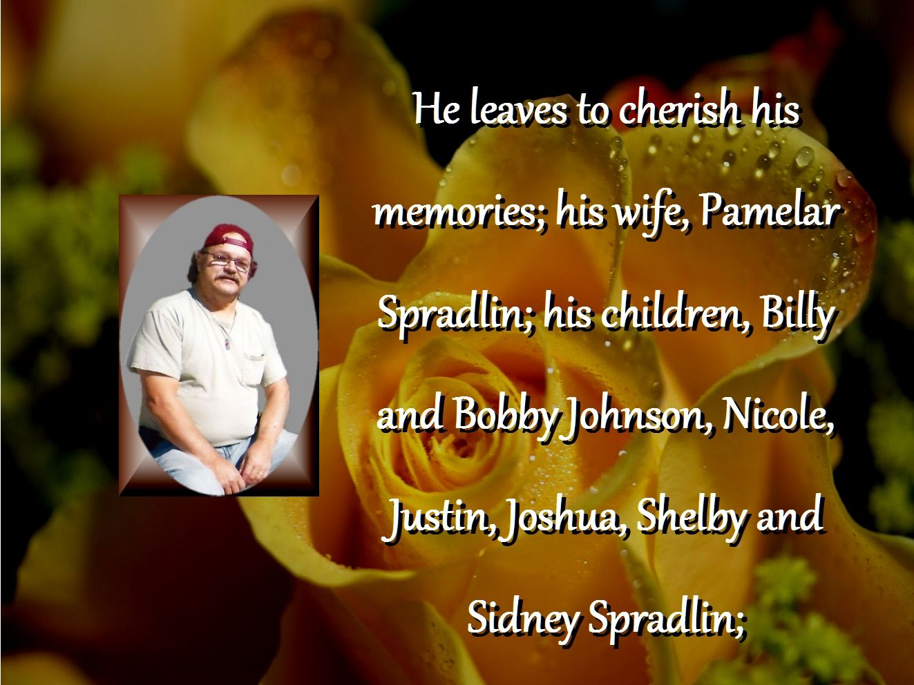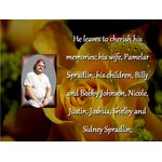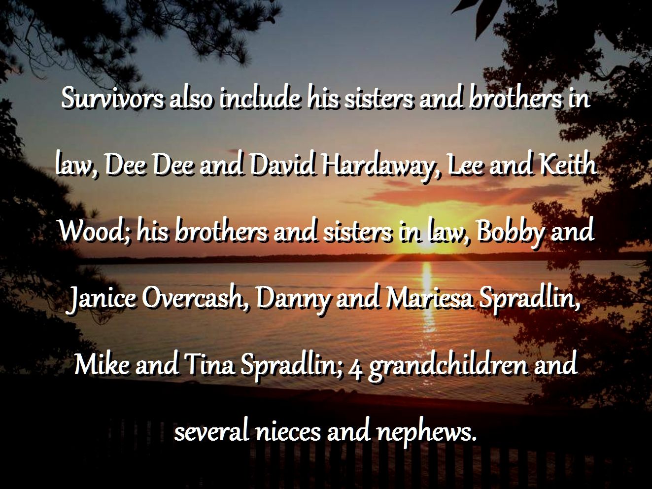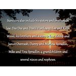 Survivors include his wife, Pamelar Spradlin; his children, Billy and Bobby Johnson, Nicole, Justin, Joshua, Shelby and Sidney Spradlin; his sisters and brothers in law, Dee Dee and David Hardaway, Lee and Keith Wood; his brothers and sisters in law, Bobby and Janice Overcash, Danny and Mariesa Spradlin, Mike and Tina Spradlin; 4 grandchildren and several nieces and nephews. He was preceded in death by his brother Roger Overcash and his granddaughter Zoey Johnson.